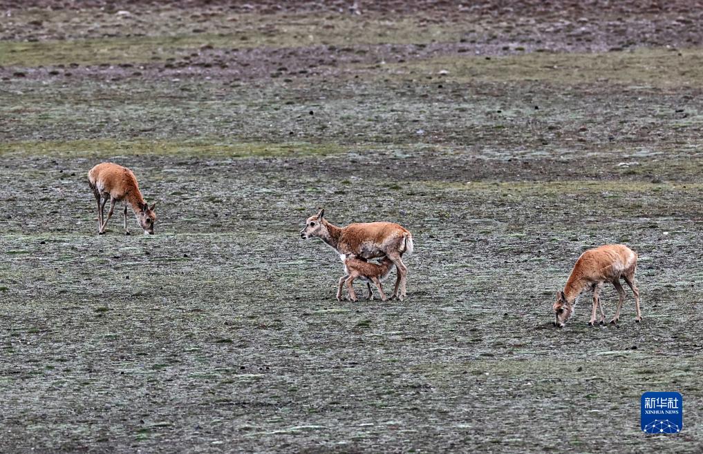 7月8日,在新疆阿爾金山國家級自然保護區(qū)兔子湖地區(qū),藏羚羊媽媽給幼崽喂奶。