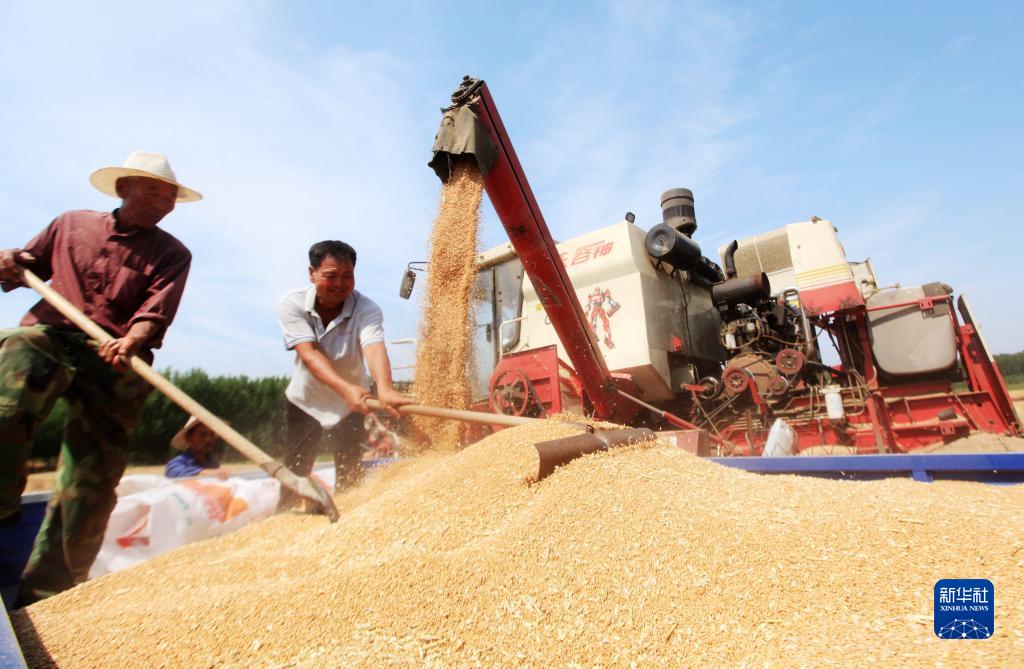 山東省臨沂市平邑縣地方鎮農民將收獲的小麥裝車(6月12日攝)。