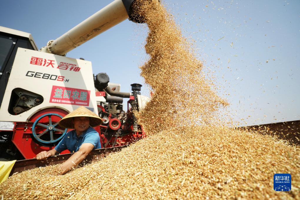 山東省臨沂市郯城縣郯城街道的農(nóng)民將收獲的小麥裝車(6月8日攝)。