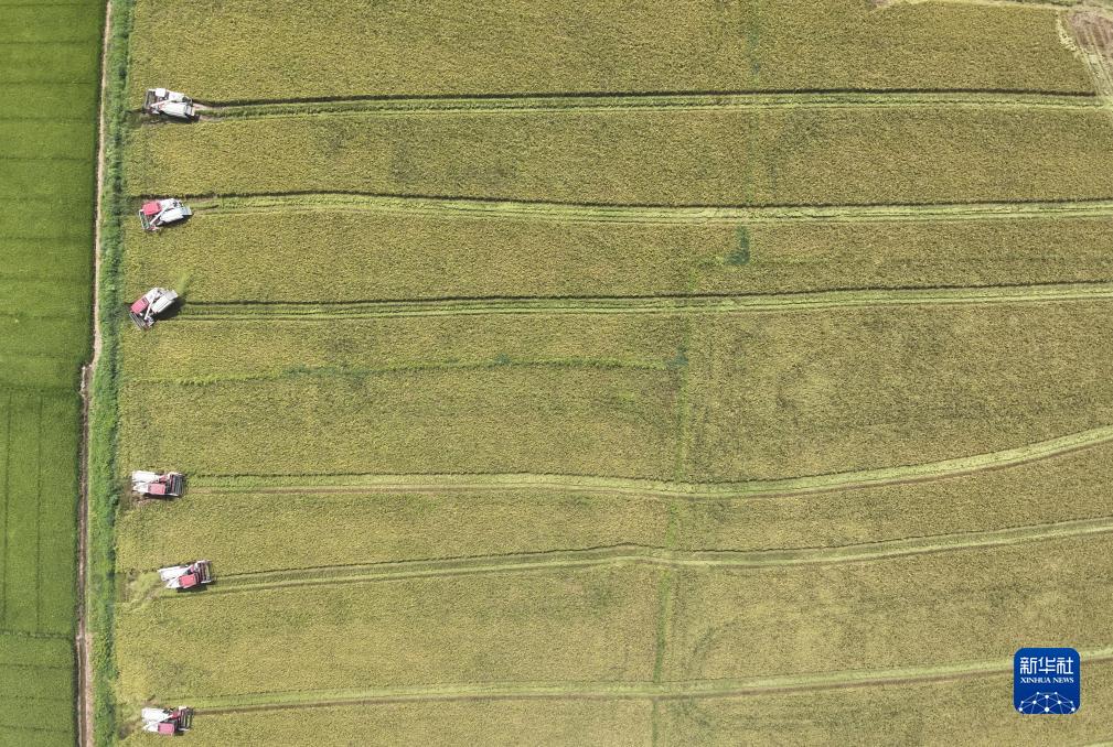 在江西省南昌縣塘南鎮(zhèn)北聯(lián)村,多臺聯(lián)合收割機(jī)在田間穿梭,搶收稻谷(7月13日攝,無人機(jī)照片)。