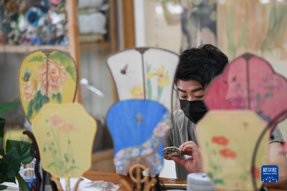 7月14日,在開封博物館,一位汴繡技師展示汴繡制作技藝。