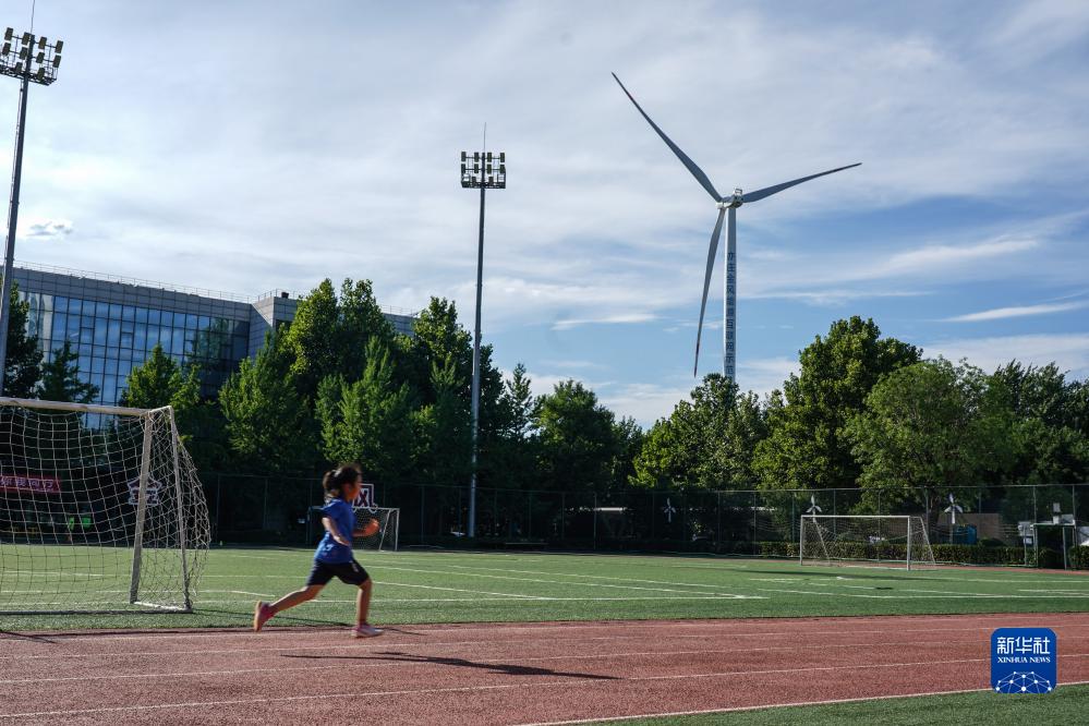 7月14日,小女孩在園區(qū)操場上跑步,遠(yuǎn)處是風(fēng)力發(fā)電設(shè)備。