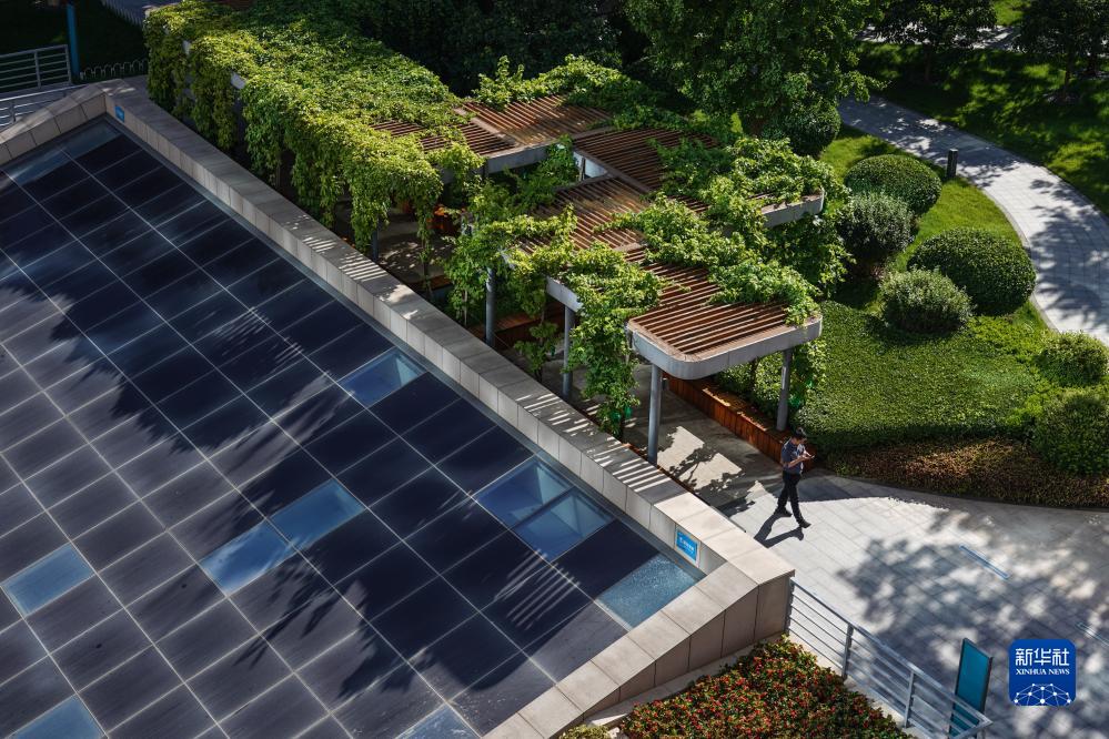 7月14日,一名工作人員在花園散步,旁邊是園區的光伏設備。