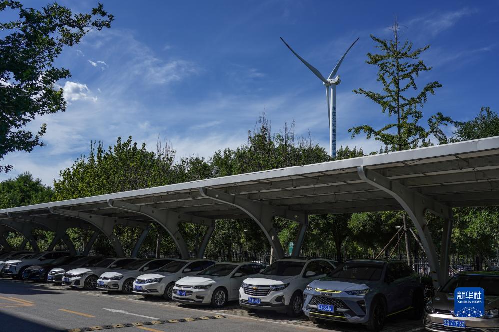 7月14日拍攝的配有光伏設備的停車區(qū),遠處是風力發(fā)電設備。
