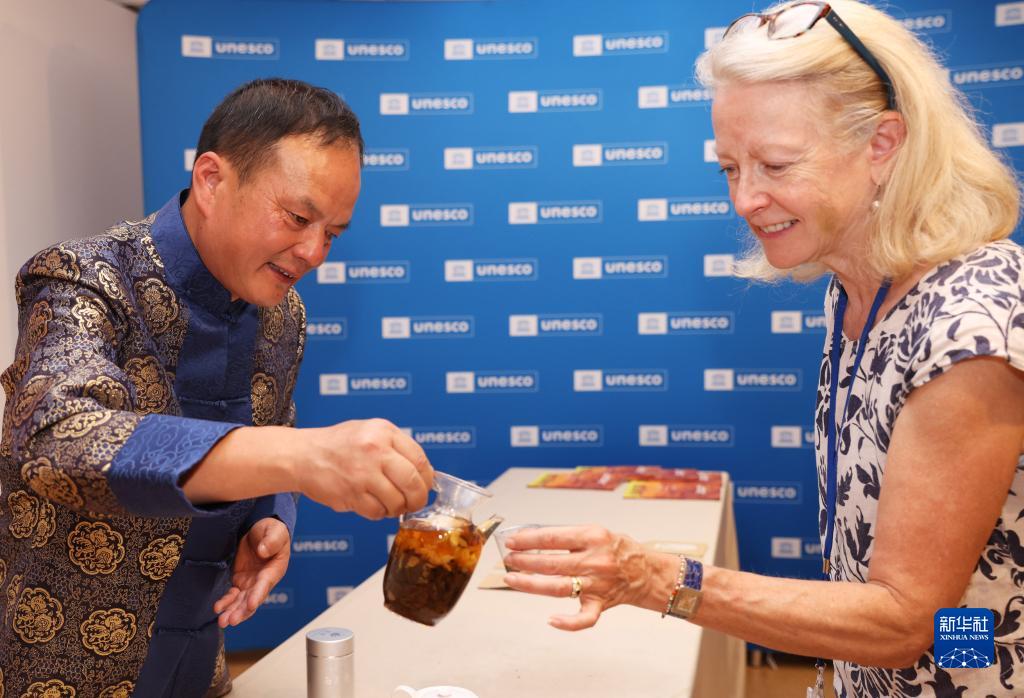 7月11日,在位于法國巴黎的聯合國教科文組織總部,嘉賓品嘗南京雨花茶。