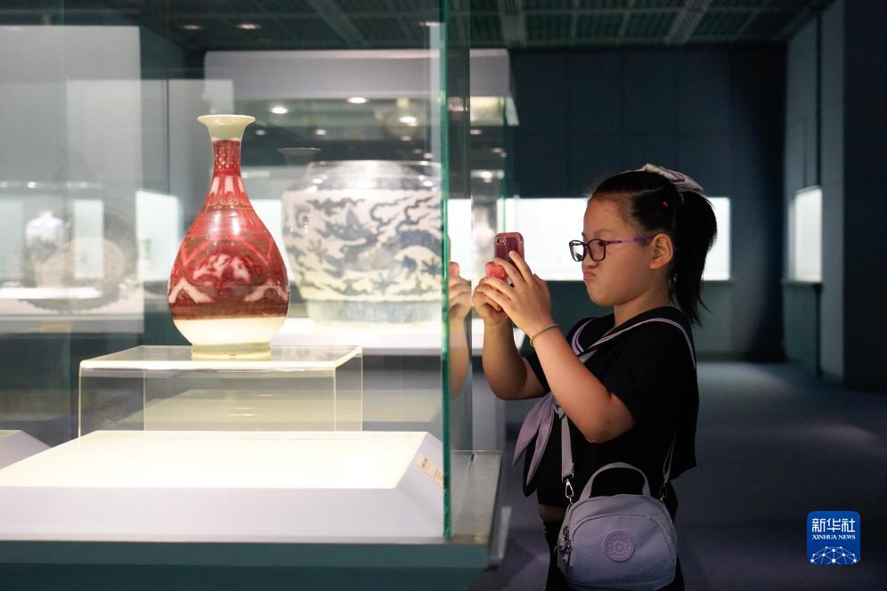 7月14日晚,小朋友在上海博物館的中國古代陶瓷館觀看展品。