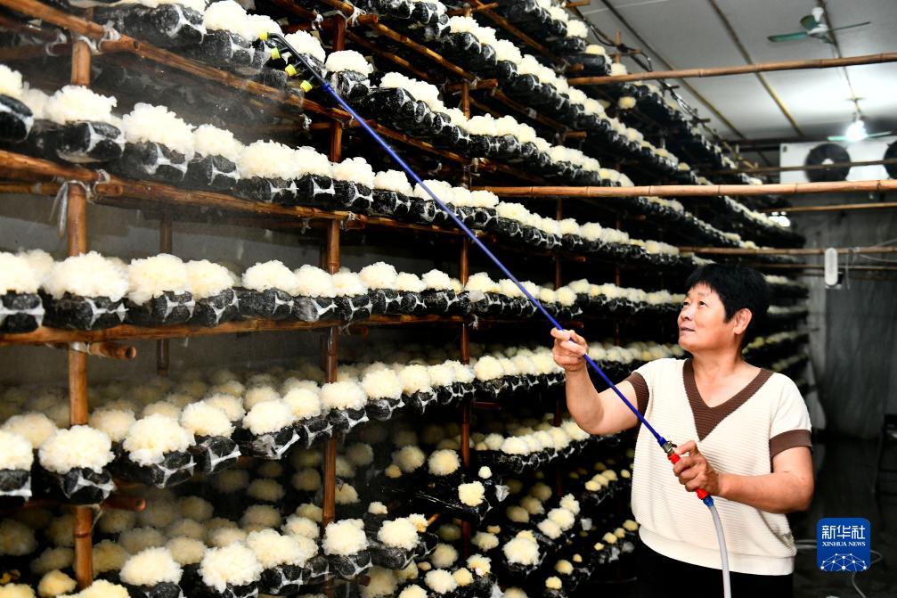 7月15日,在惠民縣胡集鎮(zhèn)銀豐食用菌種植合作社,工作人員在菇棚里為銀耳噴水。
