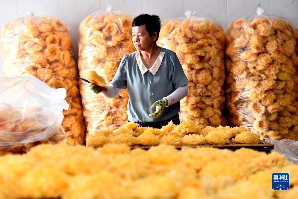 7月15日,在惠民縣胡集鎮(zhèn)銀豐食用菌種植合作社,工作人員篩選烘干后的銀耳。