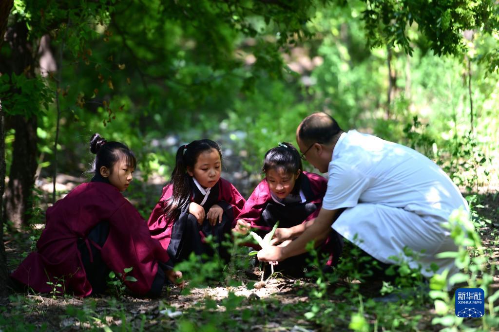 7月15日,中醫(yī)指導(dǎo)參加中醫(yī)藥文化主題夏令營的小學(xué)生在野外采藥。