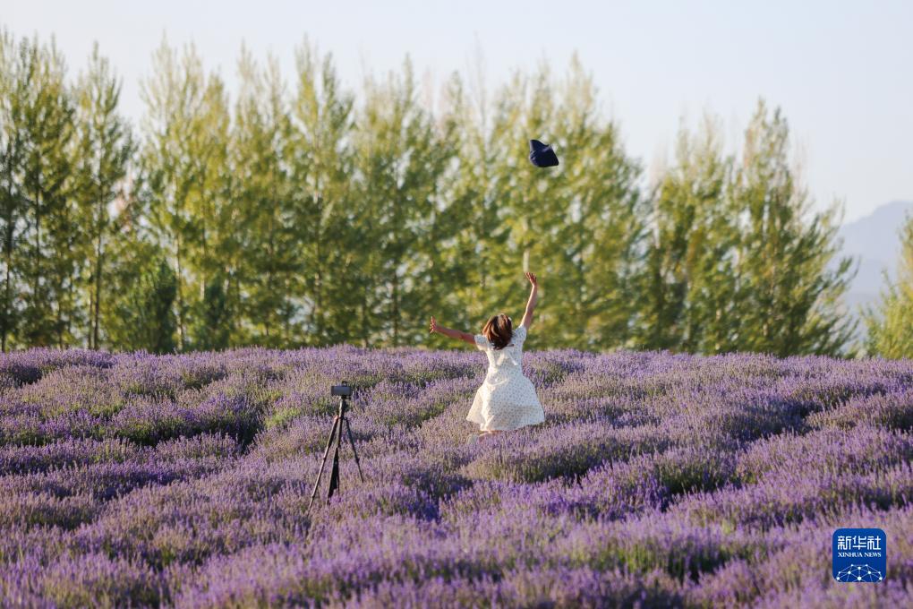 游客在霍城縣蘆草溝鎮四宮村解憂公主薰衣草農場游玩拍照(7月12日攝)。