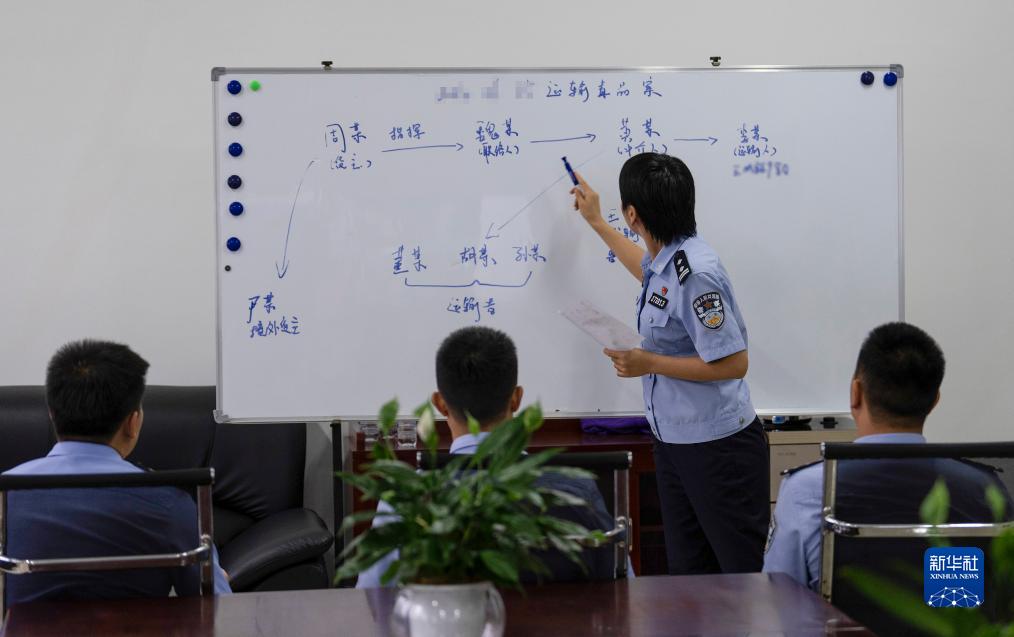 7月13日,尹銘燕(右二)和同事在模擬進行案情分析和推演。