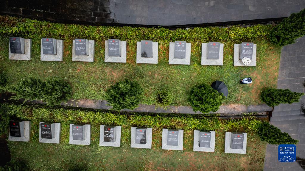 7月12日,尹銘燕在隴川縣烈士陵園祭奠犧牲的哥哥尹銘志(無人機照片)。