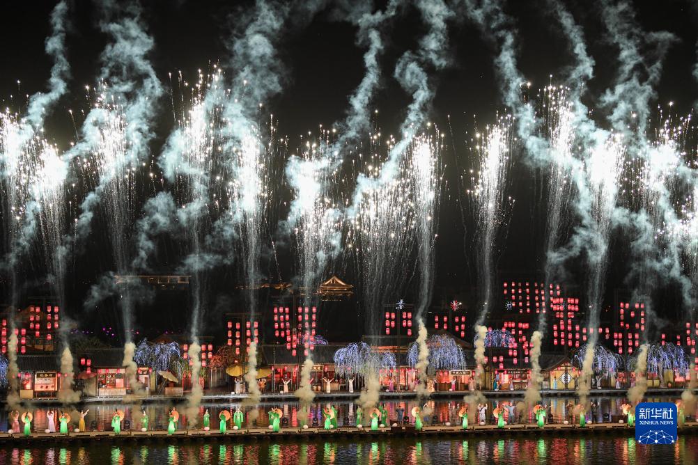 7月14日,演員在開封清明上河園景區內演繹大型水上實景演出《大宋·東京夢華》。新華社記者 吳剛 攝