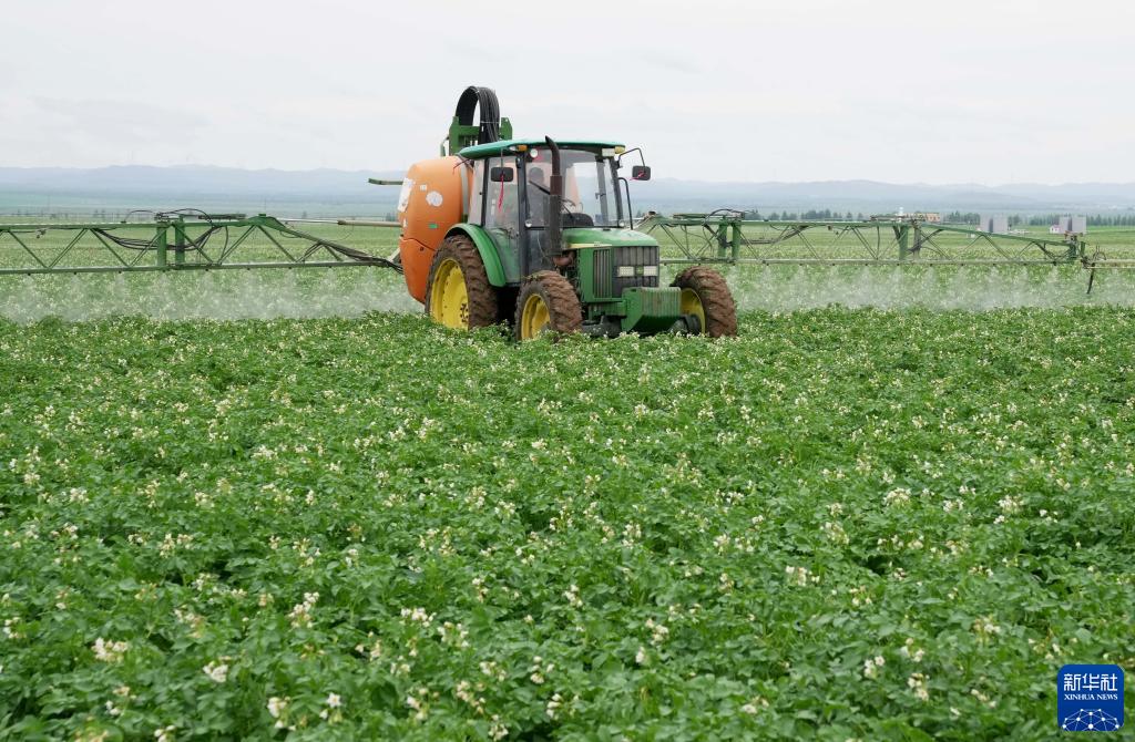 7月15日,農機手駕駛農機在張家口市塞北管理區的田間進行滅蟲作業。