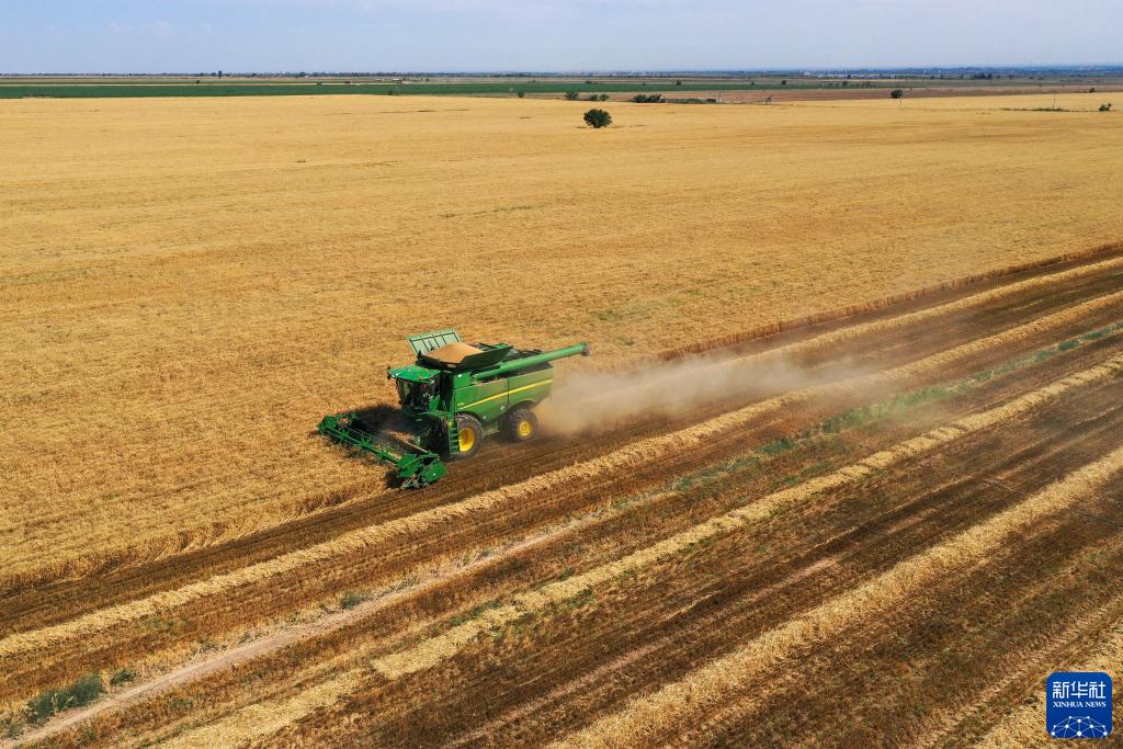 農機手駕駛聯合收割機在新疆呼圖壁縣二十里店鎮寧州戶村收割小麥(7月15日攝,無人機照片)。