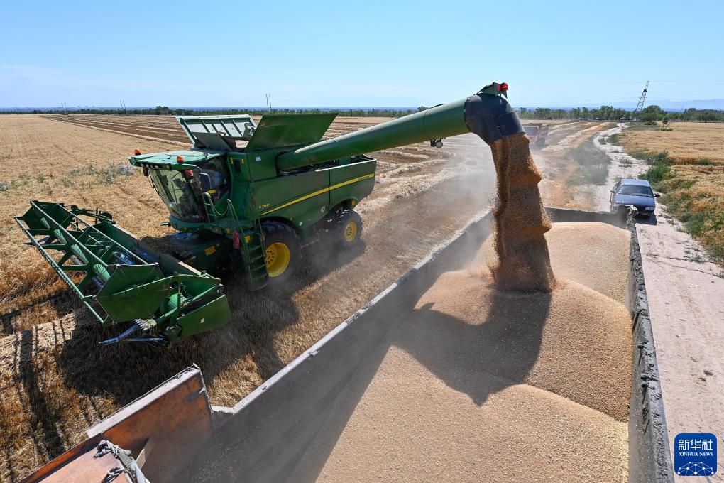 農機手操作聯合收割機在新疆呼圖壁縣二十里店鎮寧州戶村將小麥裝車(7月15日攝)。