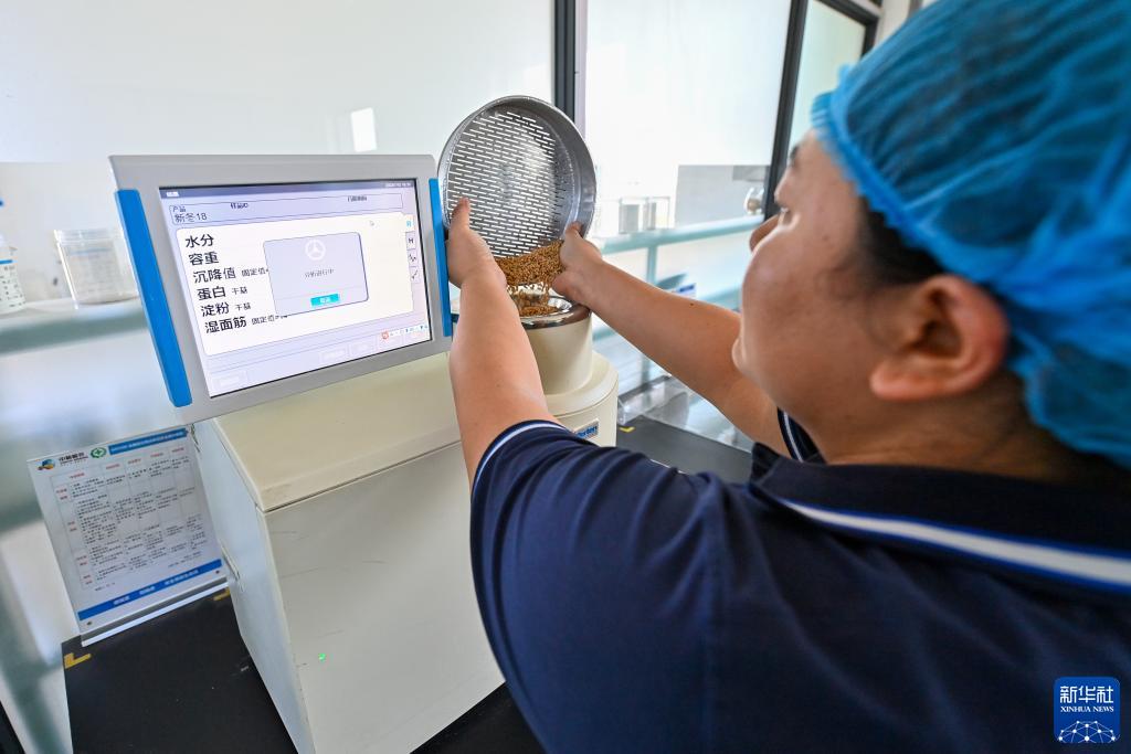 新疆呼圖壁縣一家糧食收購(gòu)企業(yè)的工作人員對(duì)交售的小麥進(jìn)行檢測(cè)(7月15日攝)。