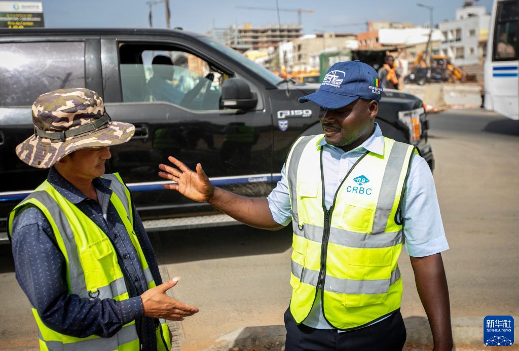 5月13日,蘇信(右)在塞內(nèi)加爾達(dá)喀爾快速公交項(xiàng)目建設(shè)工地與同事交流。新華社記者 李亞輝 攝