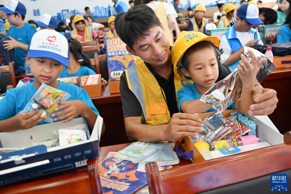 7月15日,在山東青島中鐵建工上合大廈項(xiàng)目部“小候鳥”驛站,來(lái)自河南信陽(yáng)的建筑工人陳朋(中)帶領(lǐng)兩個(gè)兒子陳浩楠(右一)、陳昊宇一起拆禮物。