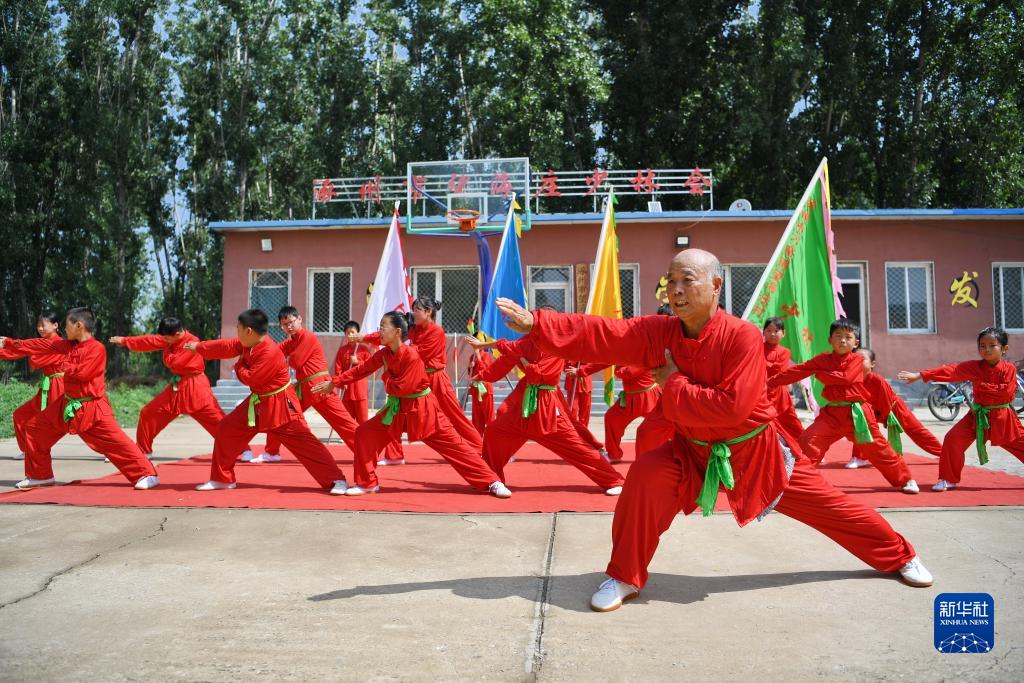 7月16日,傳統武術望海莊少林會非遺傳承人楊守培(前)在河北省涿州市刁窩鎮望海莊村指導學生練習武術動作。