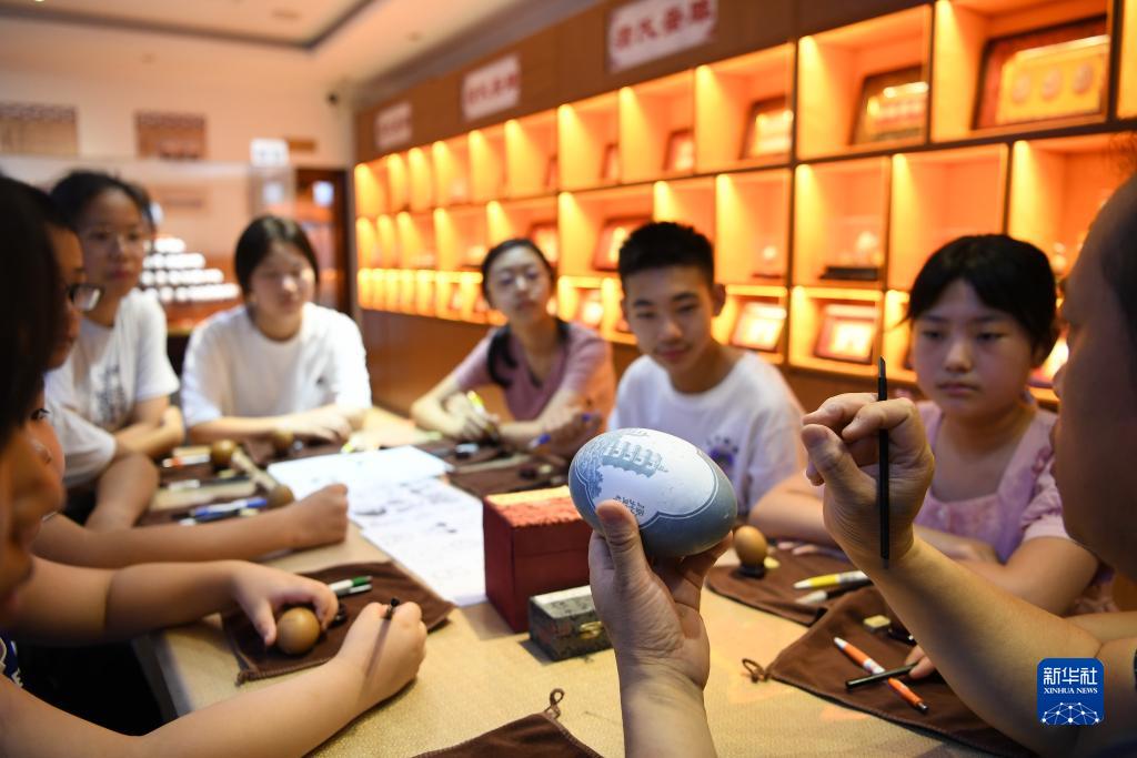 7月15日,學生在河北省涿州市蒲氏蛋雕非遺傳承館內學習蛋雕制作技藝。