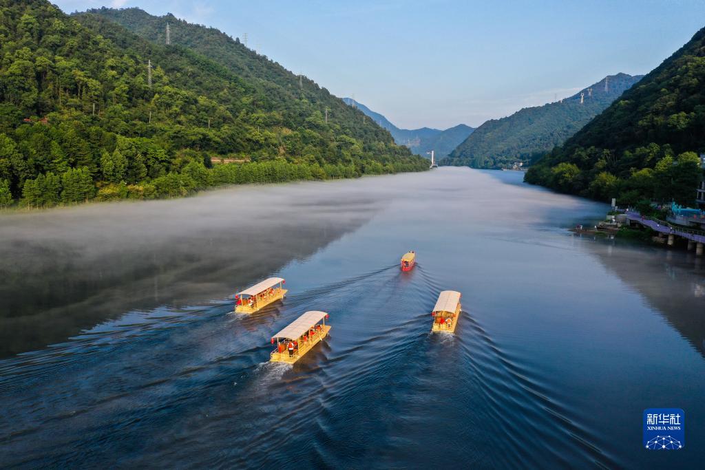 7月16日清晨,游客乘坐“竹筏”造型電動游船,在建德新安江的江霧中前行(無人機照片)。