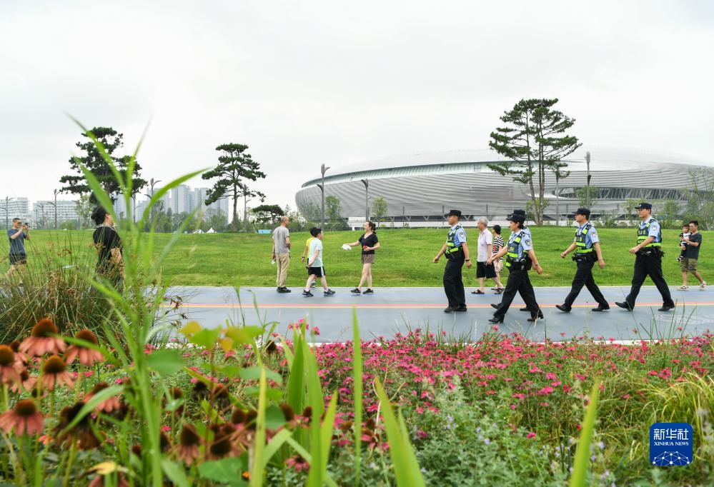 在成都市龍泉驛區東安湖體育公園,杜以萍(前右四)帶領民警巡查(7月12日攝)。