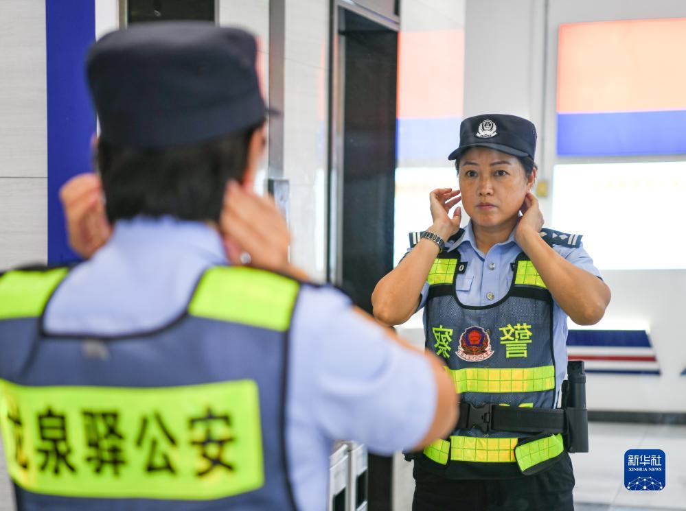 在成都市龍泉驛區東安派出所,杜以萍在出發巡訪前整理著裝(7月12日攝)。