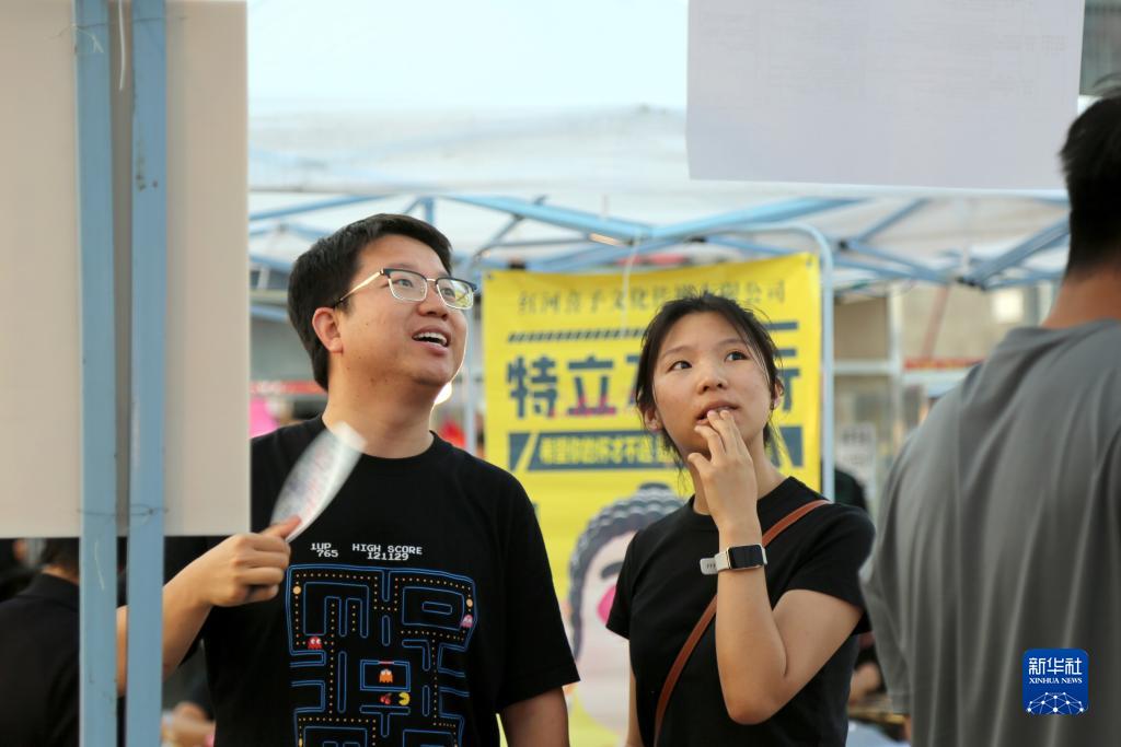 7月15日晚,求職者在云南省紅河哈尼族彝族自治州蒙自市大樹寨的“青年人才夜市”招聘會現場查看崗位信息。