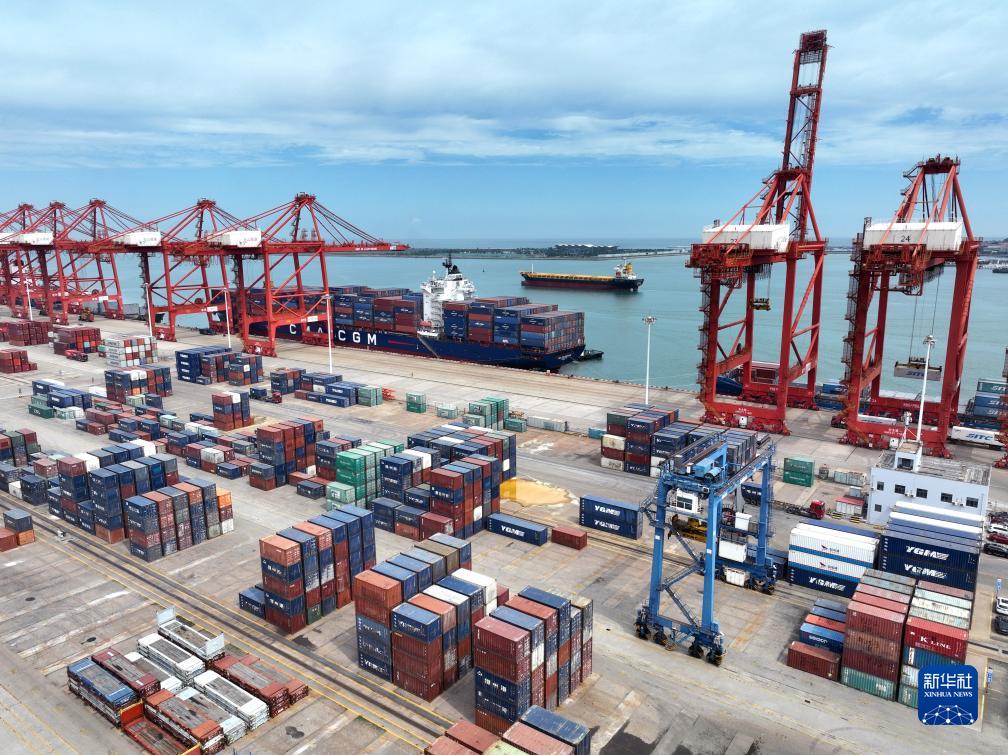 7月16日,貨輪在江蘇連云港港集裝箱碼頭泊位上裝卸集裝箱(無人機(jī)照片)。