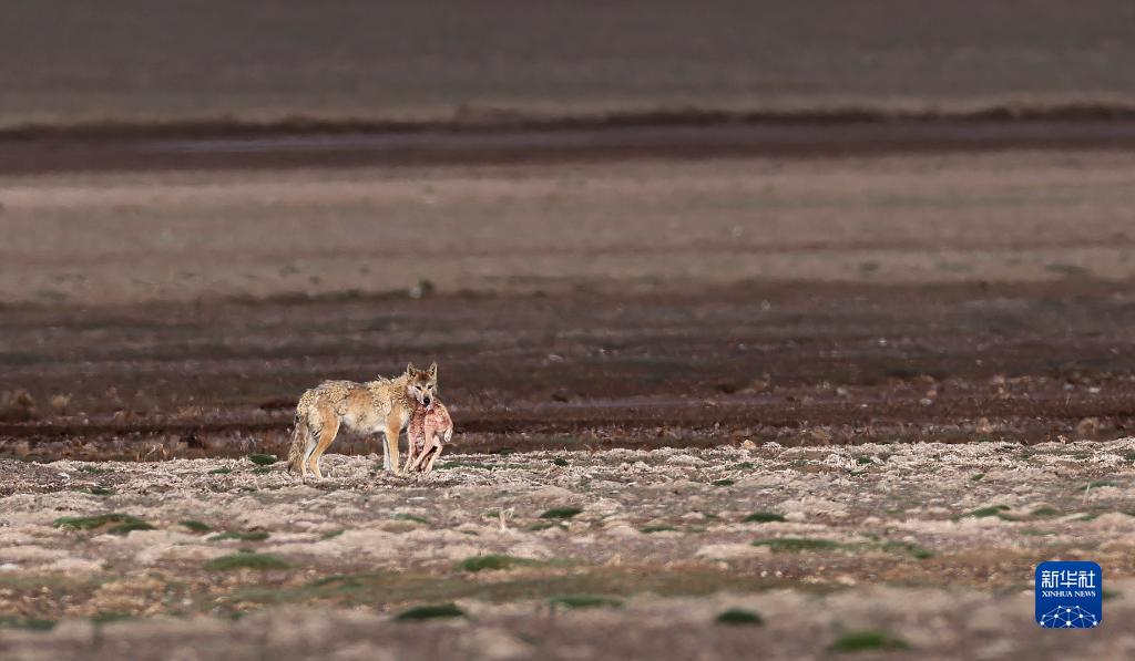7月10日,在新疆阿爾金山國家級自然保護區,一只狼叼著剛捕獲的藏羚羊幼崽。