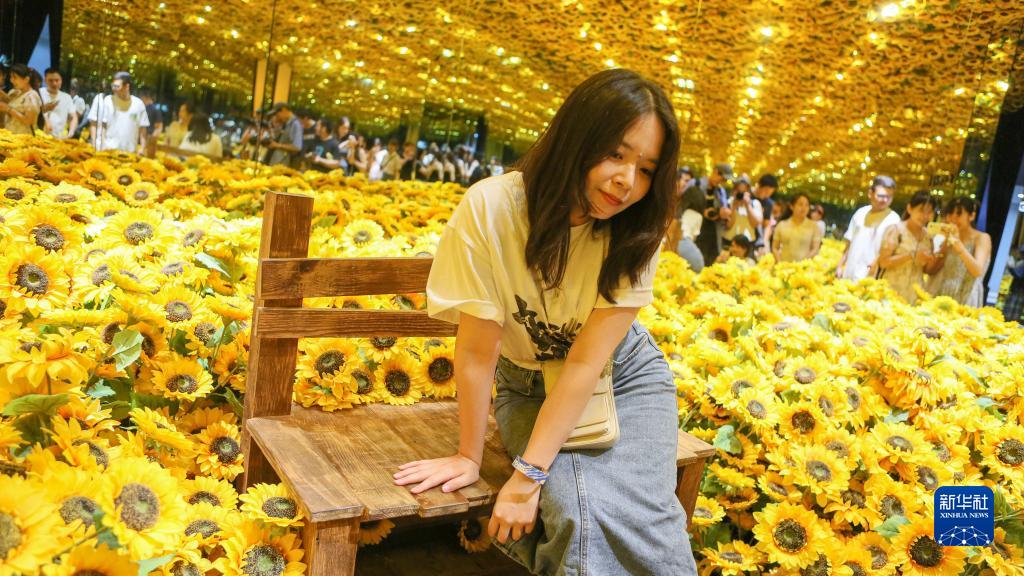 7月16日晚,參觀者在“梵高再現”光影展上的向日葵鏡廳拍照留念。