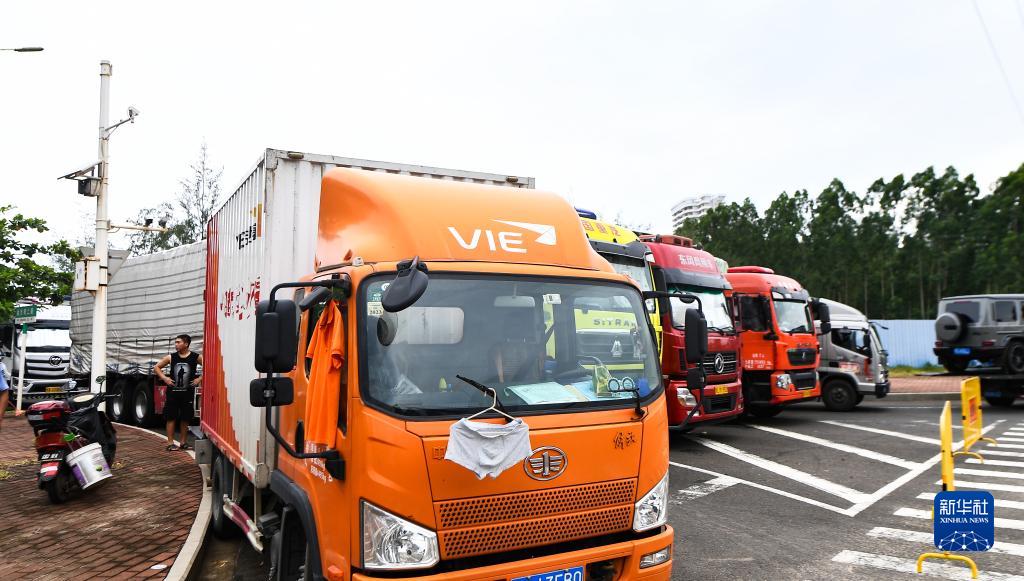 7月17日,不少貨車停放在金沙灣二路等地,等待臺風過后通過瓊州海峽。