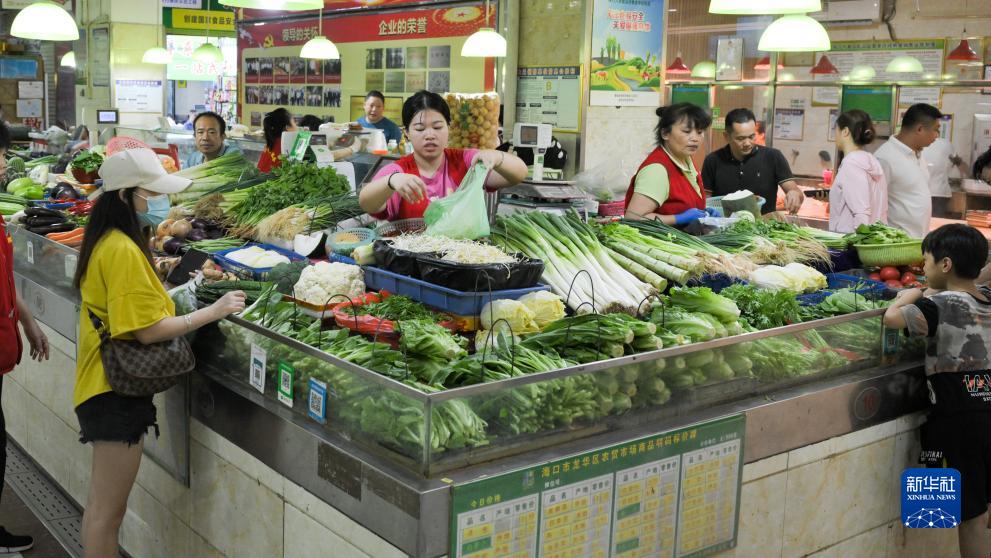 7月17日,在海口市金貿文華農貿市場,市民有序選購蔬菜。