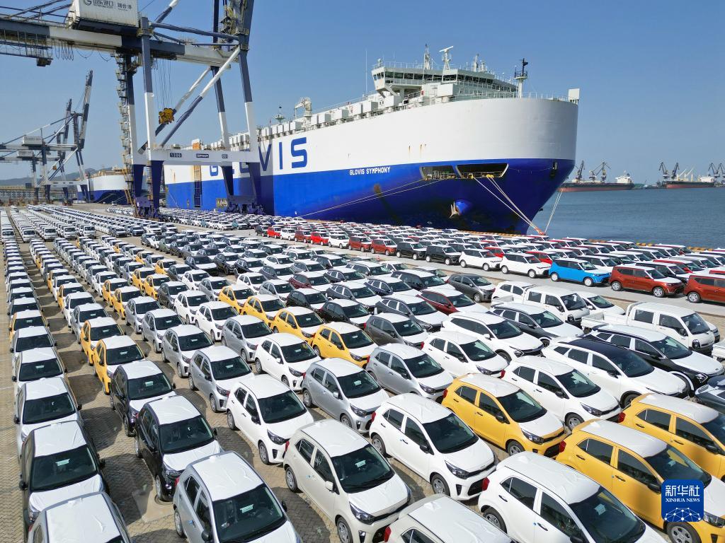 大批出口商品車集結山東港口煙臺港準備通過汽車滾裝船發運(7月5日攝,無人機照片)。