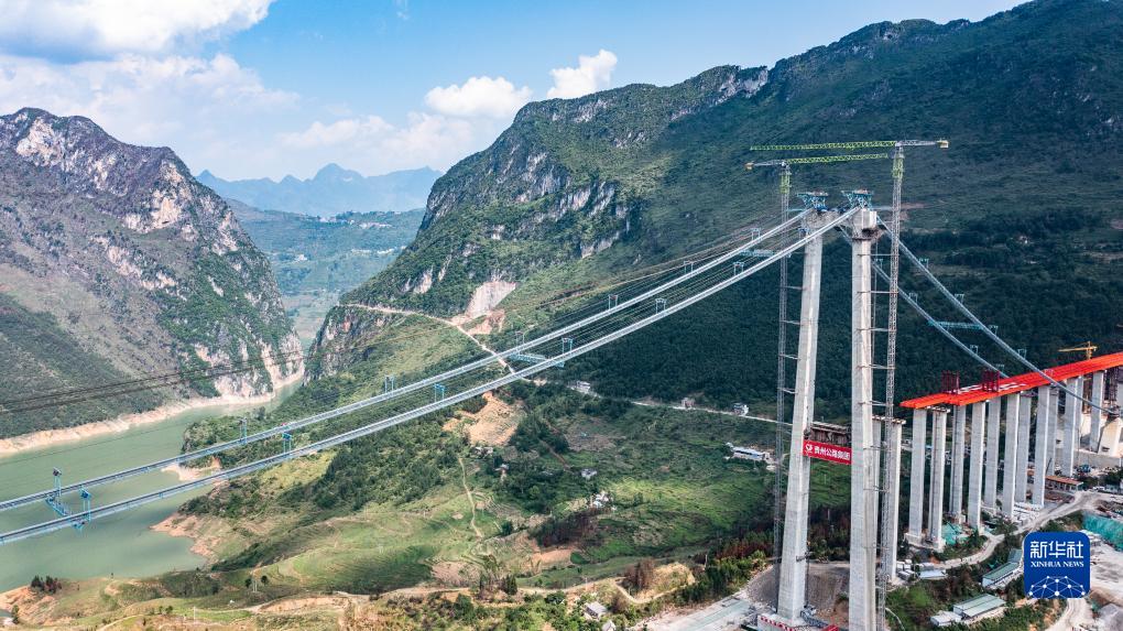 貴州納晴高速牂牁江大橋主纜牽引順利完成(6月25日攝,無人機照片)。