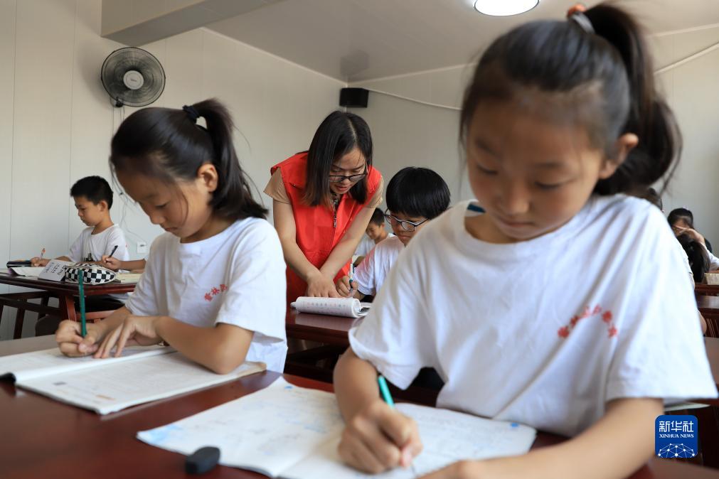 7月17日,在河北省滄州市孟村回族自治縣辛店鎮董林村國學館,志愿者為孩子們輔導暑期作業。