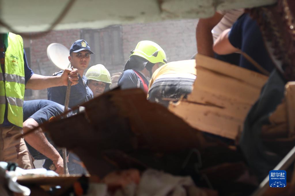 7月17日,救援人員在埃及首都開羅的居民樓坍塌現場工作。