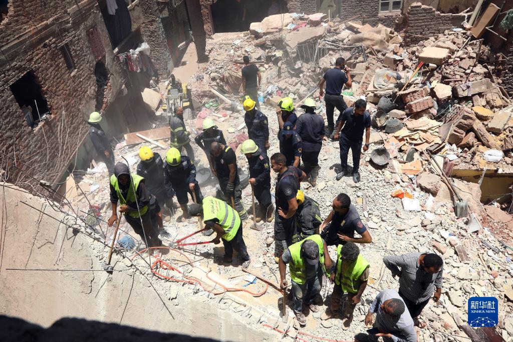 7月17日,救援人員在埃及首都開羅的居民樓坍塌現場工作。