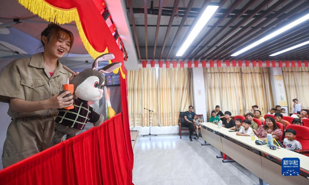 7月20日,在嘉興市秀洲區新塍鎮陡門村文化禮堂,秀湖音樂廳小橙堡兒童藝術劇團在演出兒童劇《紅鼻頭哥哥和小木偶們》。