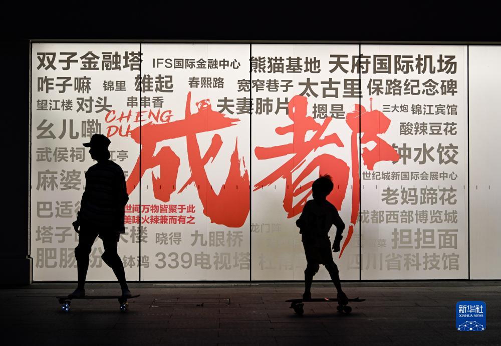 7月14日,在四川成都高新區鐵像寺水街,一位母親帶著兒子在玩滑板。