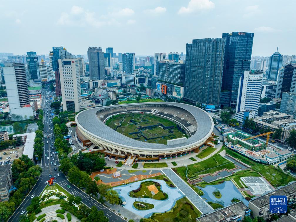 7月20日拍攝的成都東華門遺址公園外場遺址區(下)以及位于成都體育中心內的內場遺址區(無人機照片)。