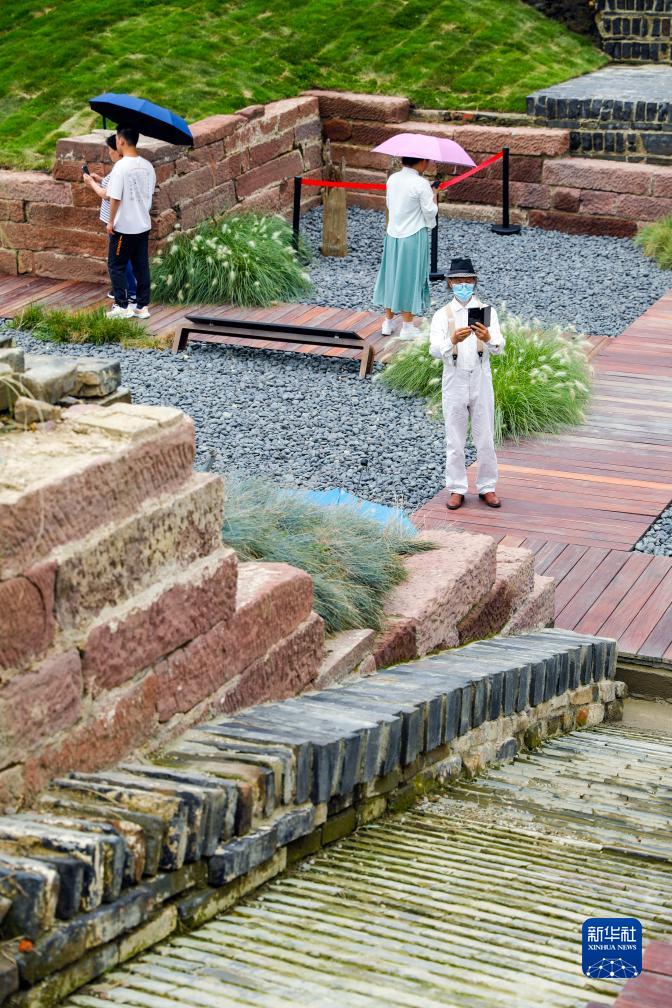 7月20日,在成都東華門遺址公園外場遺址區(qū),人們在參觀原狀展示的明代蜀王府水道踏道遺跡。