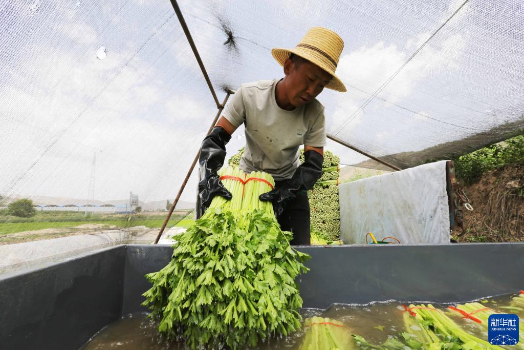 7月20日,甘肅省定西市安定區香泉鎮農民在地頭簡單清洗蔬菜,準備裝車。