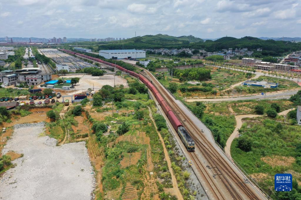7月19日,滿載外運小汽車的貨運列車駛出廣西柳州雒容汽車物流基地(無人機照片)。