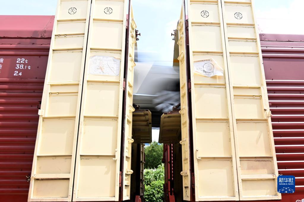 7月19日,在廣西柳州雒容汽車物流基地,駕駛員駕駛小汽車行駛在鐵路貨車車廂內。