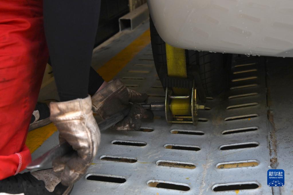 在廣西柳州雒容汽車物流基地,身著橘色制服的駕駛員嫻熟地駕駛著一輛輛小汽車在貨運列車車廂內行駛。到達指定位置停車后,駕駛員用緊固帶對車輪進行固定,完成裝載。