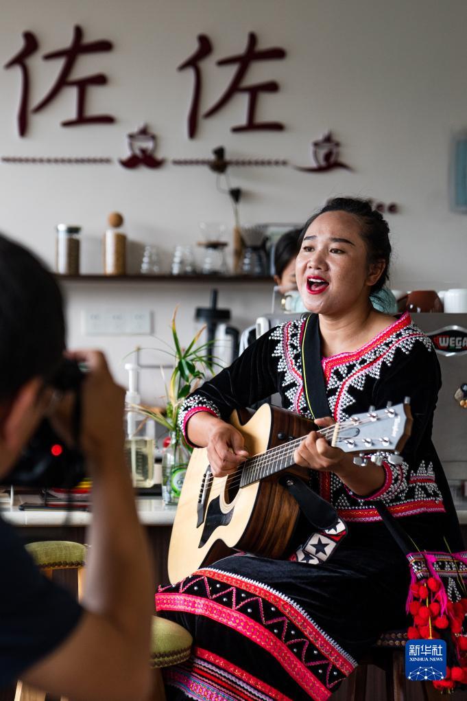 瀾滄縣東回鎮班利村村民郭玉蘭演唱原創歌曲(7月20日攝)。