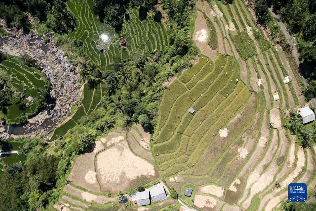 這是7月20日在印度尼西亞西爪哇省茂物地區(qū)的鄉(xiāng)間拍攝的稻田(無(wú)人機(jī)照片)。當(dāng)前正值稻米收獲季。