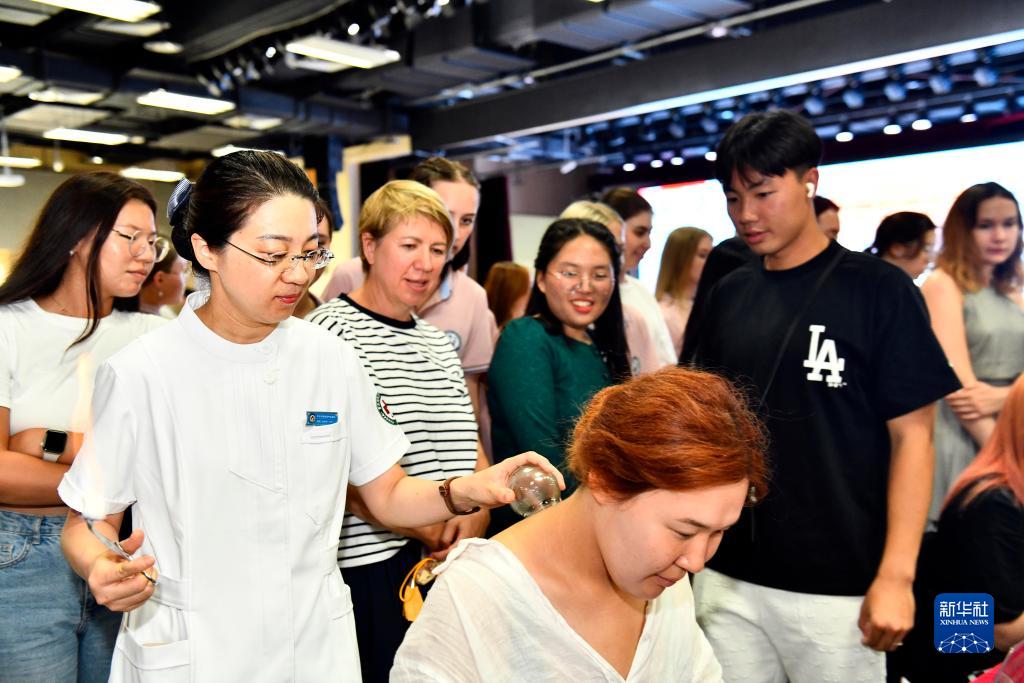 7月20日,在中國石油大學(華東)沉浸式中醫藥文化體驗中心,黃島區中醫醫院的醫護人員為留學生拔罐。